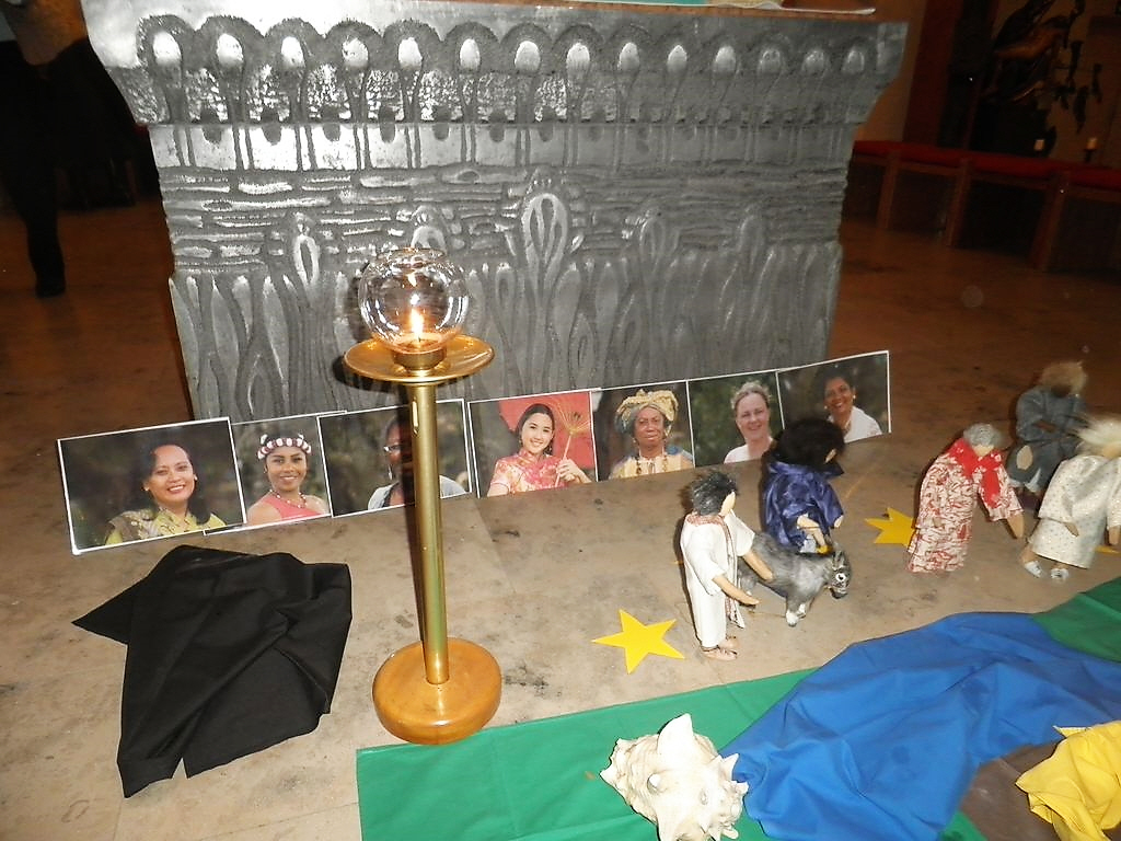 Im Verlauf des Gottesdienstes, der von verschiedenen Liedern aus Surinam (begleitet von Herrn Winckler an der Orgel) verschönert wurde, stellten Team-Mitglieder mehrere Frauen aus Surinam vor, die den verschiedenen Volksgruppen und Religionen angehören, die aufgrund der kolonialen Vergangenheit heute dort vorzufinden sind: z.B. die Ureinwohner, die sich „Arawak“ nennen, die „Maroons“ (Nachkommen versklavter Afrikaner), Chinesen, Kreolen, Buren, Inder, Indonesier. Es gibt Christen aller Konfessionen, Muslime und Juden in dem kleinen Land.