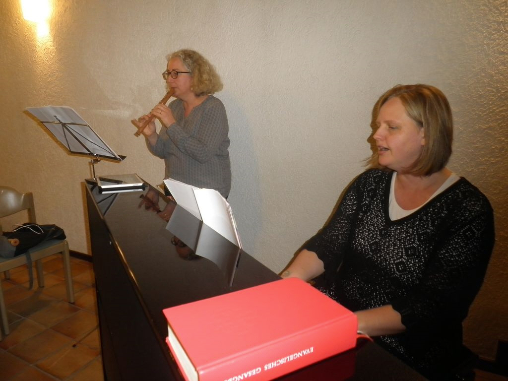 Das Eingangslied „Eingeladen zum Fest des Glaubens“ wie auch die folgenden Lieder waren in Text und Melodie ausgesprochen fröhlich. Kristel Neitsov-Mauer am E-Klavier und Flötistin Flavia Sorba konnten die zahlreich anwesenden Frauen (es wurden auch vereinzelte Männer gesichtet) zu lebhaftem Mitsingen animieren. Wie immer kamen Frauen aus dem gastgebenden Land mit ihren speziellen Problemen zur Sprache, indem „unsere“ Frauen ihnen ihre Stimme liehen. Das Thema „Gastmahl und Gastfreundschaft “ war auch Thema der Predigt von Frau Fritz – was lag da näher als Jesu Gleichnis vom großen Festmahl aus dem Lukasevangelium. Nach Vaterunser, Segen und Abendlied ging man versehen mit viel neuer Information hinaus in den frühen Abend, schon ein wenig gespannt, was man nächstes Jahr über das ferne Land Simbabwe erfahren wird.