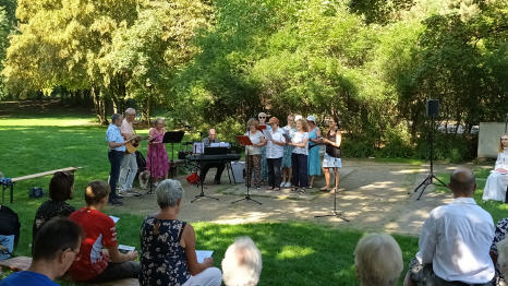 Das Wetter meinte es diesmal mit allen gut, und so fanden an diesem Morgen doch ca. 70 Besucherinnen und Besucher den Weg in den Freizeitpark, um auf der großen Wiese einen ökumenischen Familiengottesdienst miteinander zu feiern. Eltern mit Kindern und Großeltern sowie Alleinstehende und Paare waren dabei. Im Mittelpunkt stand die Geschichte aus dem Neuen Testament, in der Jesus den blinden Bartimäus sehend macht, und dieser ihm daraufhin nachfolgt. Die Geschichte wurde aber nicht vorgelesen, sondern sehr ausdrucksstark von einigen Personen aus dem Vorbereitungsteam vorgespielt.